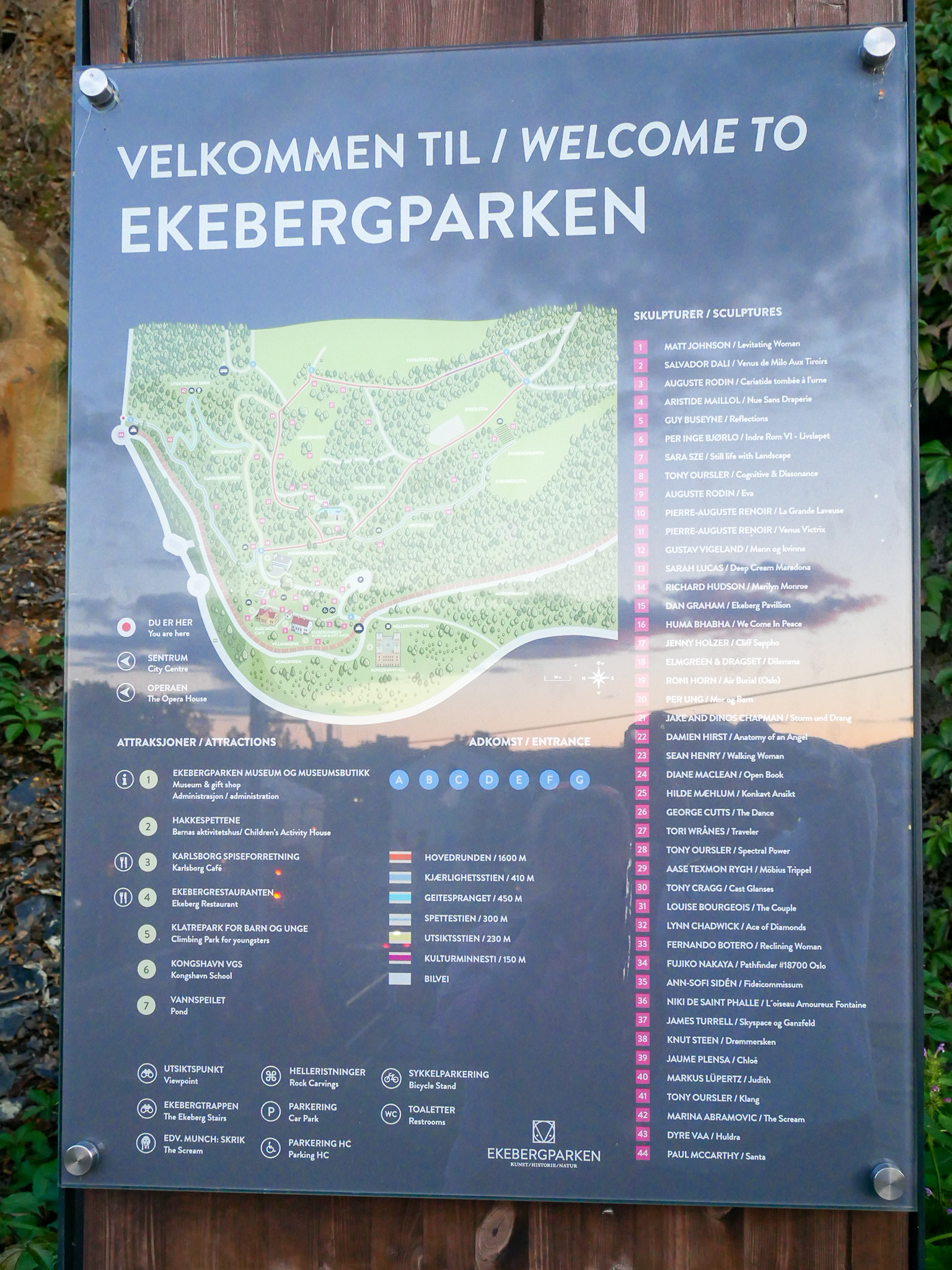 We rode our bikes to Ekebergparken from the city centre. There are no docking stations in the park but there is one opposite Oslo Hospital which is a 2 minute walk from one of the entrances. The park is on a hill with paved trails and surprisingly great views of the city. It’s free with 44 interesting sculptures to find, which can be found here.