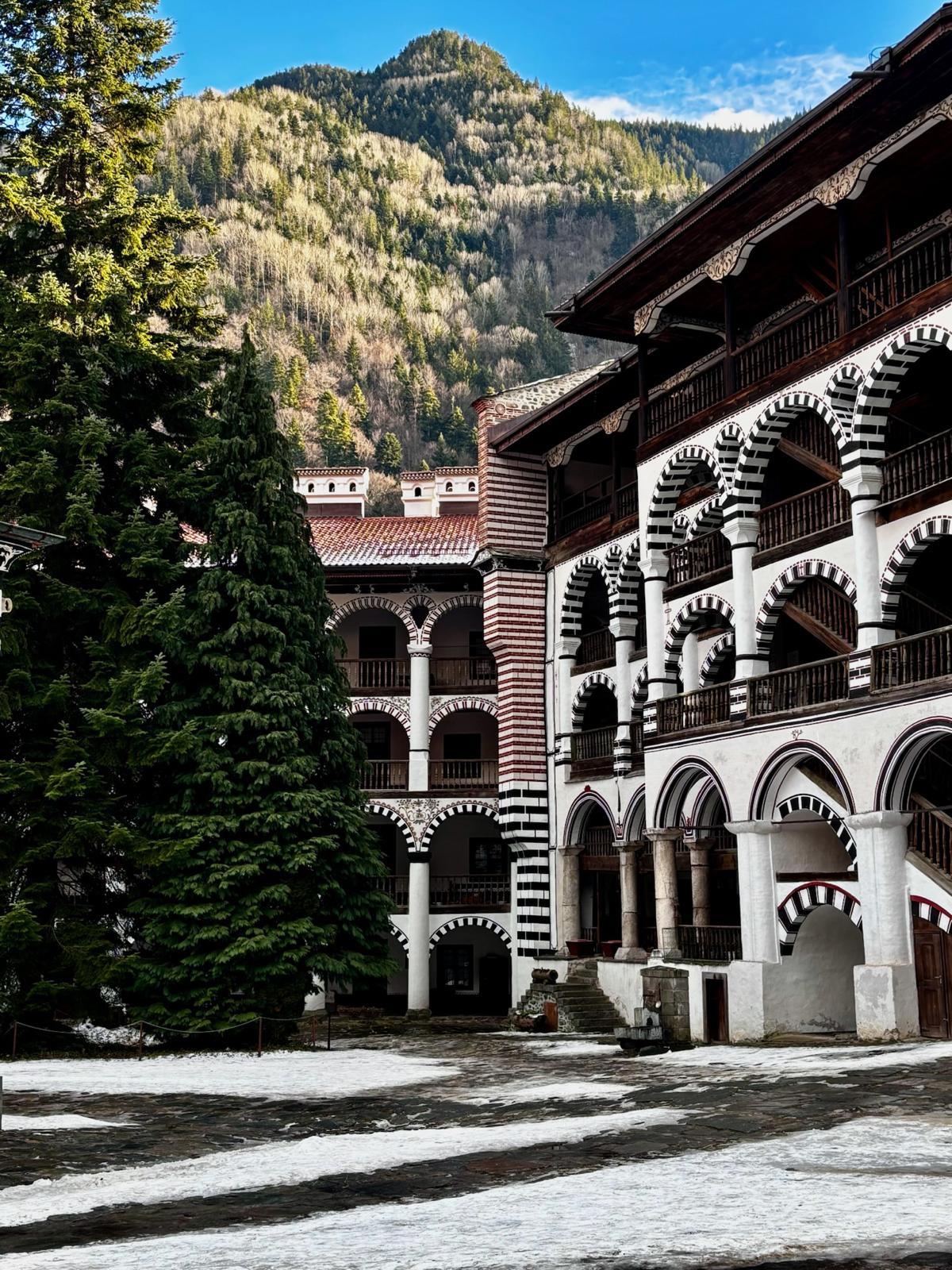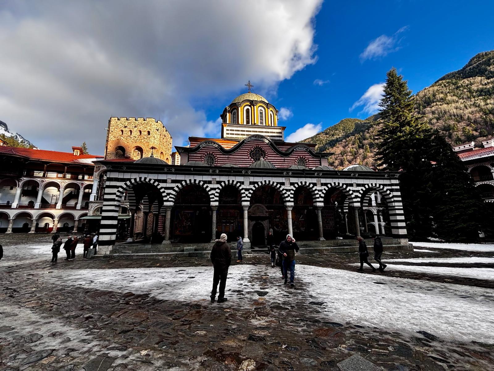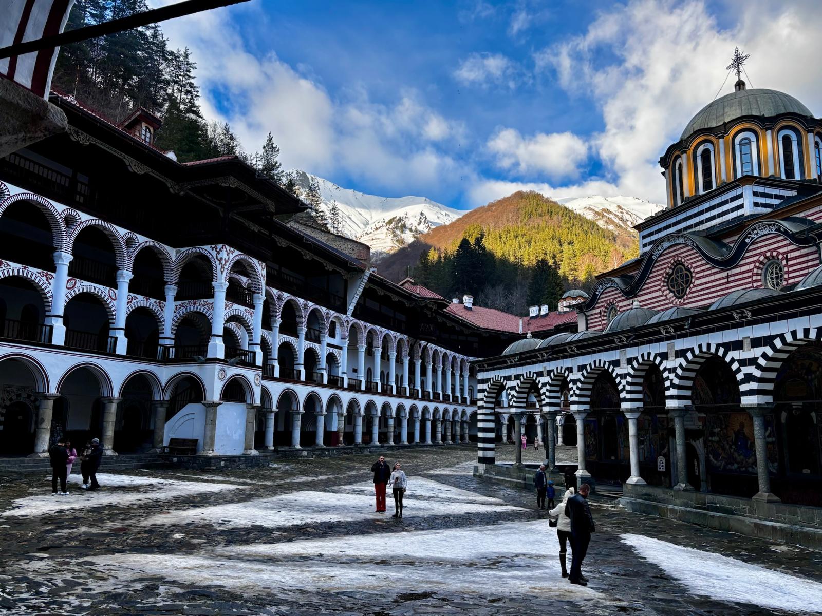 The Rila Mountains are home to the stunning Rila Monastery, which we visited on our way to Blagoevgrad—the town where we stayed for the entire trip. The journey from Sofia Airport took about two hours and only 40 mins from Blagoevgrad. The drive through the mountains was beautiful, with snow-covered trees lining the road. Entry to the Rila Monastery complex and church is free, while parking outside the monastery costs £3